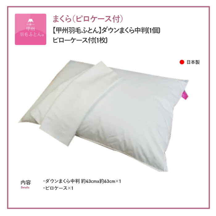 提供元:株式会社タキ・リビング 商品説明 名称 【甲州羽毛ふとん】ダウンまくら中判(1個) ピローケース付(1枚) 内容 ■ダウンまくら(収納用の専用ケースに入れてお届けします。