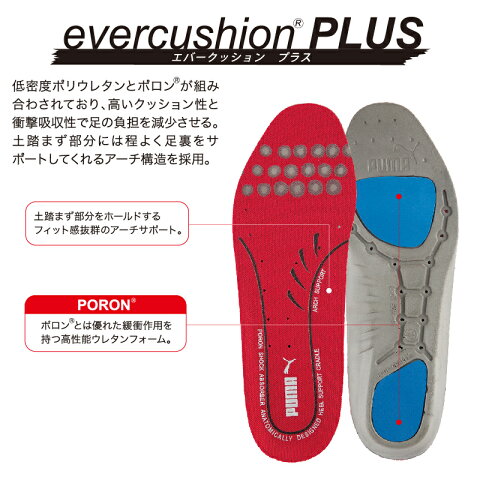 インソール 中敷き プーマ204510 低密度のポリウレタンとポロンが組み合わされており、高いクッション性と衝撃吸収性で足の負担を減少させる。