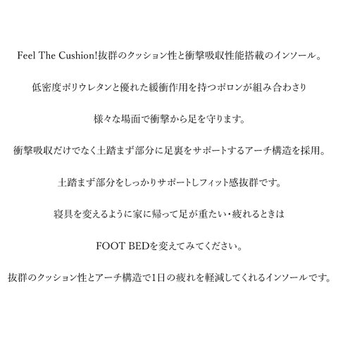 商品説明 ”インソールで快適な時間を!” Feel The Cushion!抜群のクッション性と衝撃吸収性能搭載のインソール。